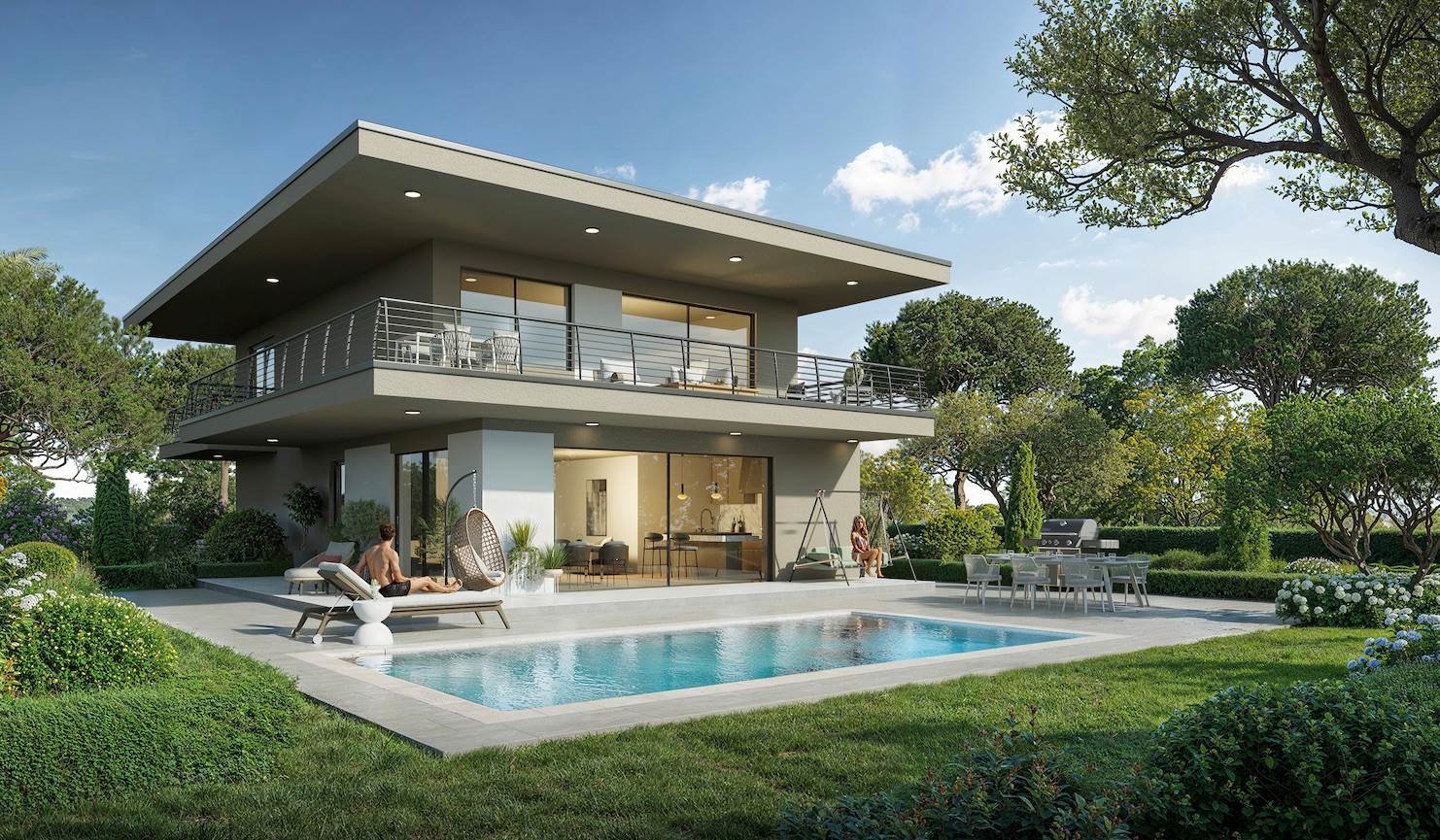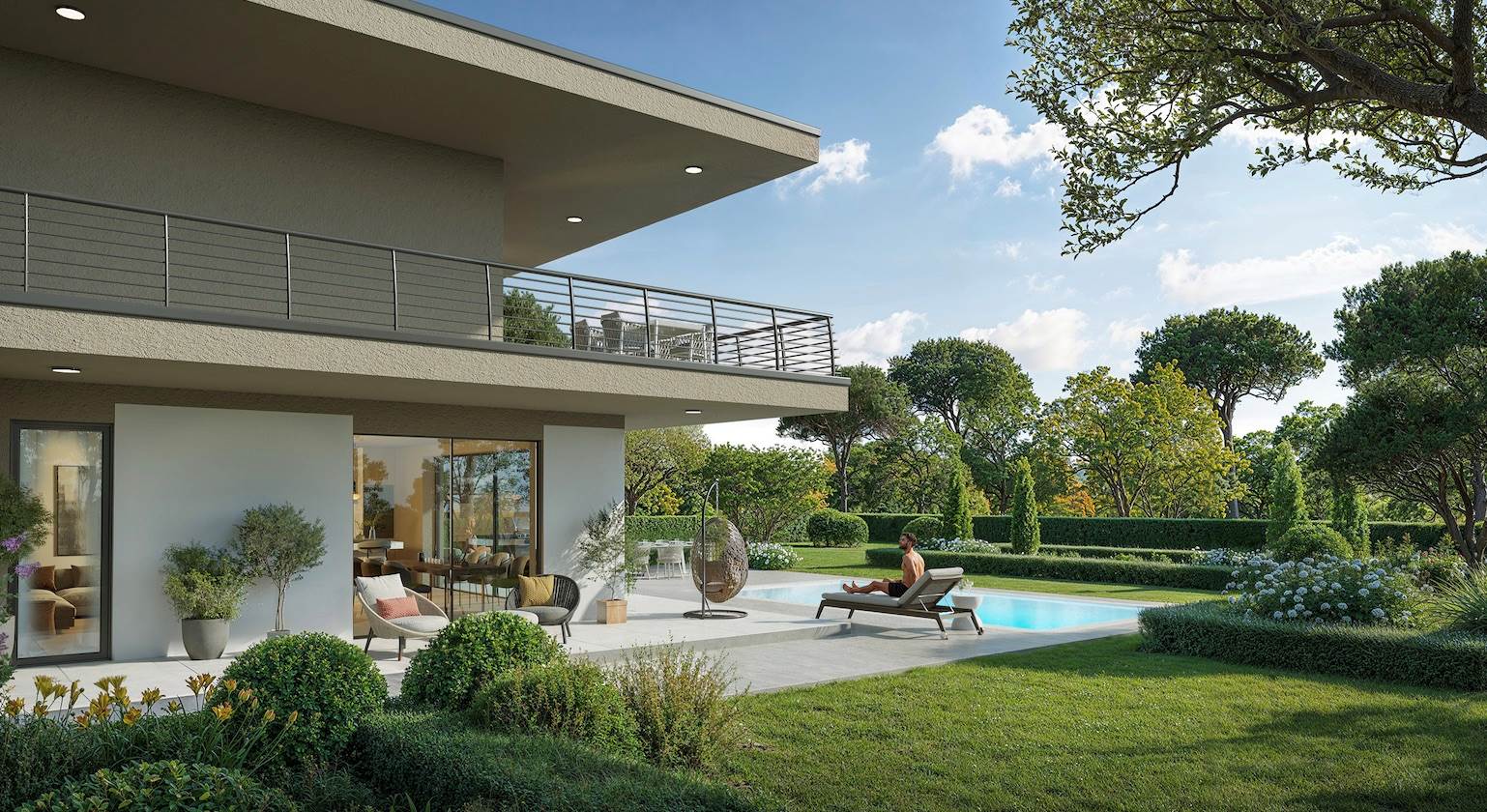 In posizione collinare privilegiata, a pochi passi dal centro e dalle spiagge, nascerà una villa di design contemporaneo che offre una vista lago spettacolare.