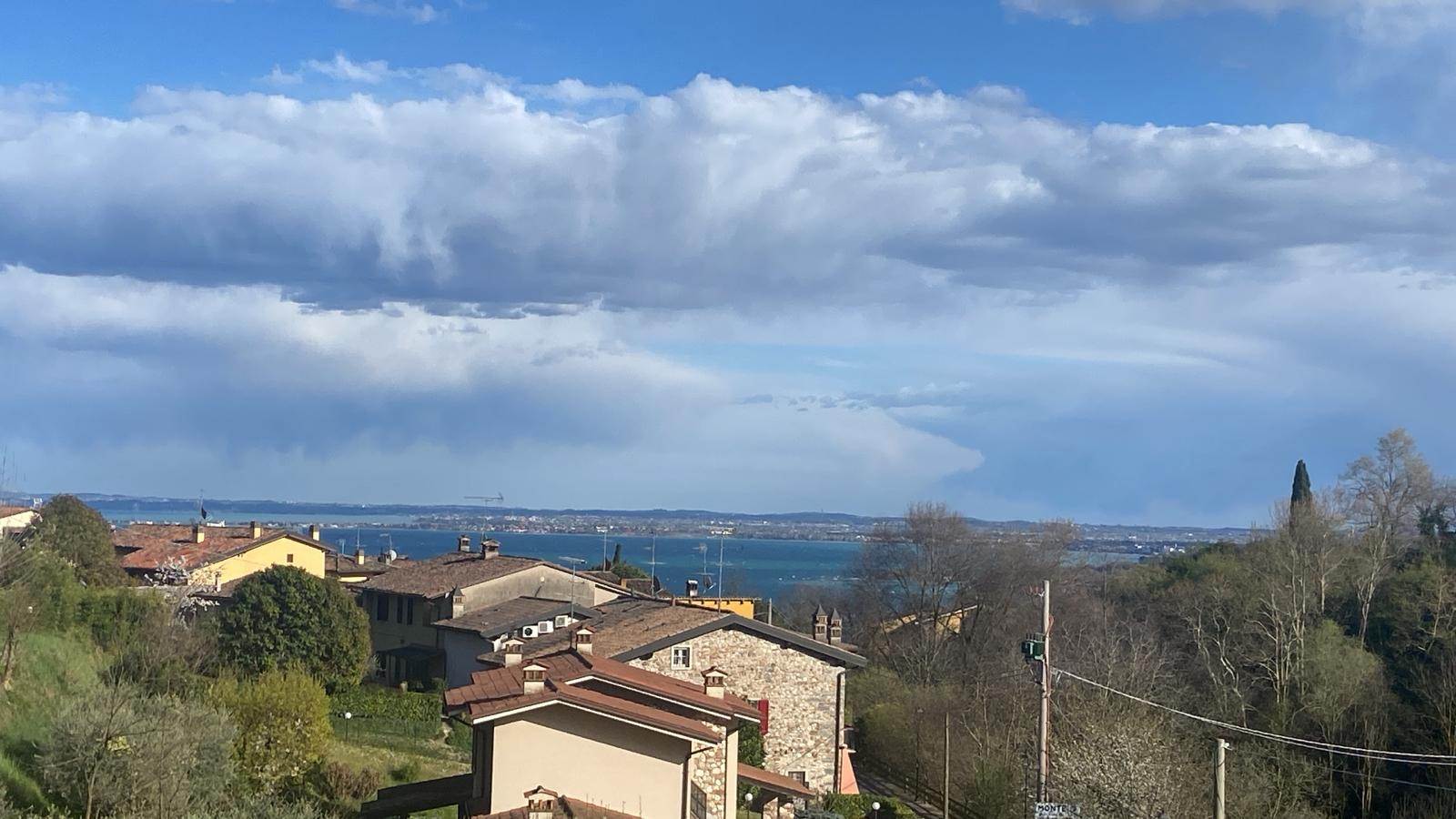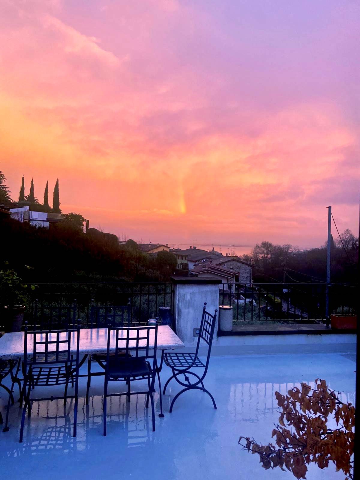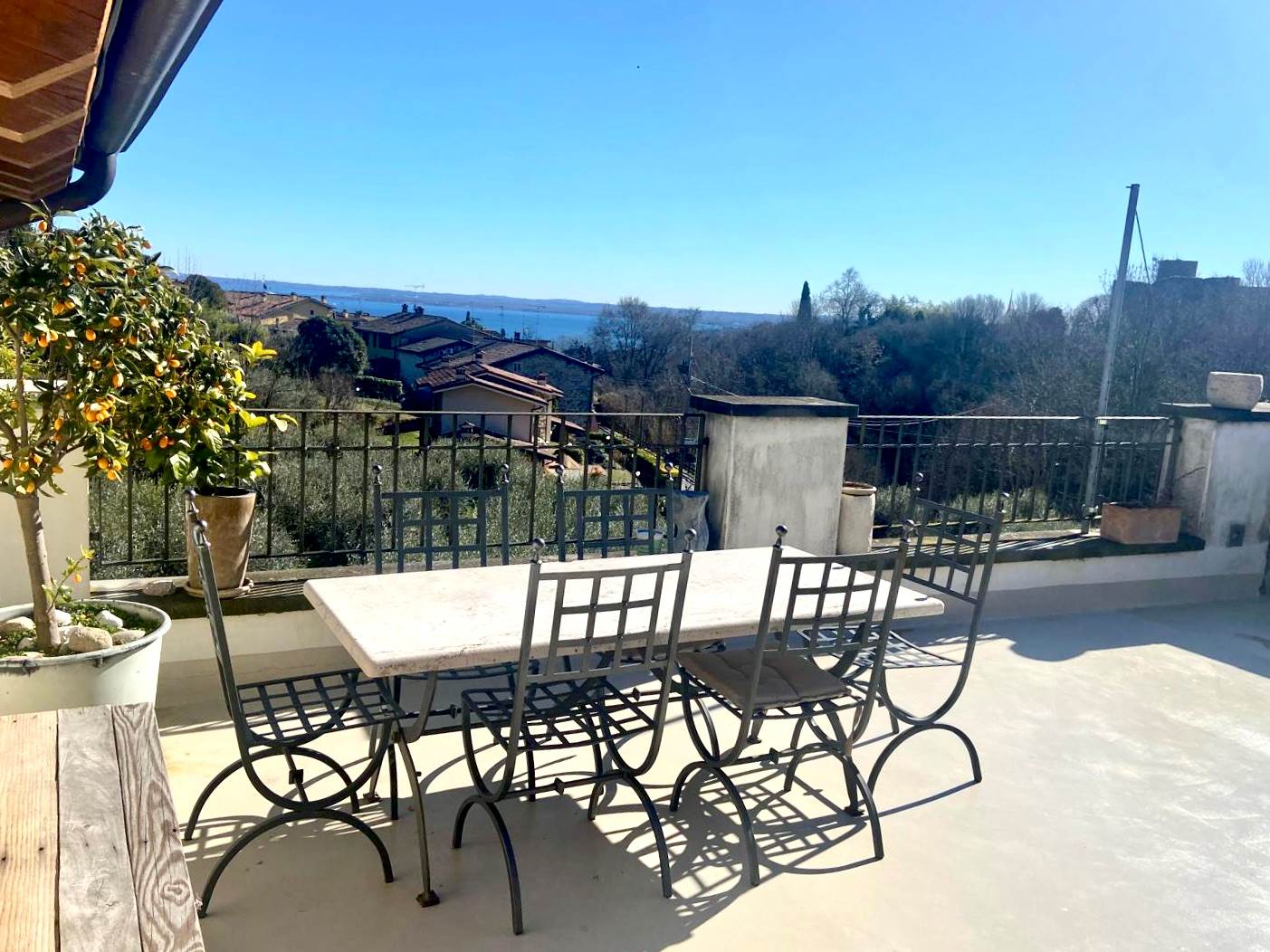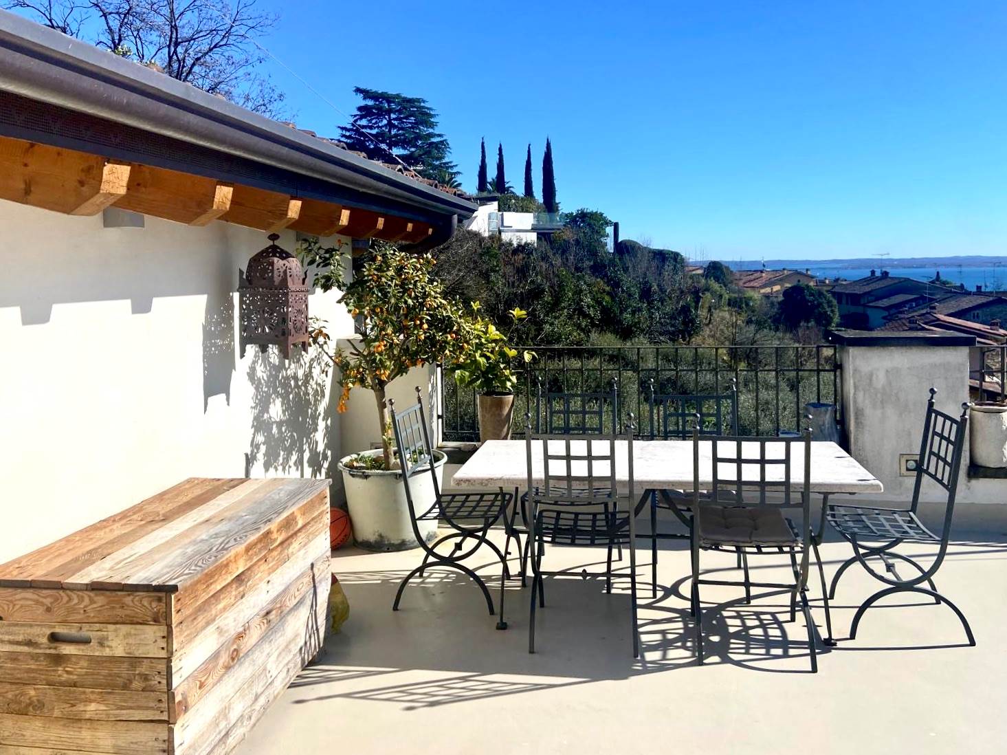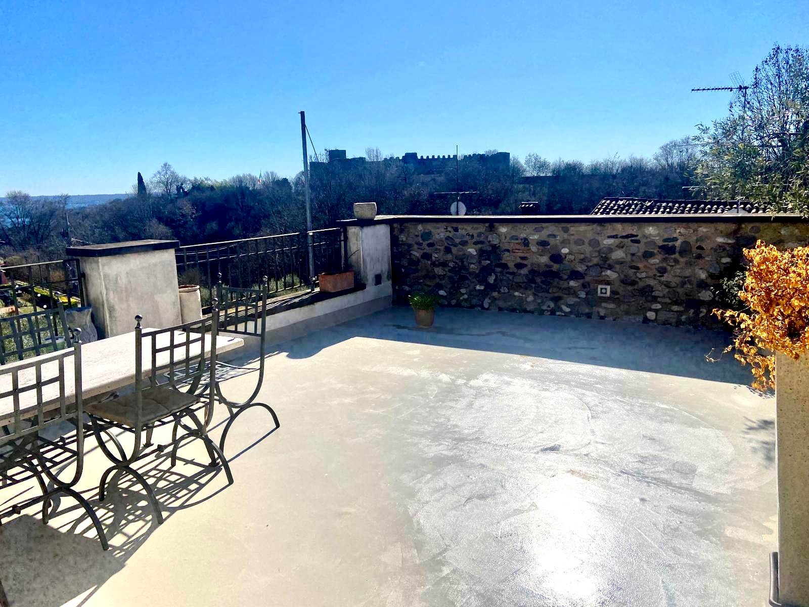 Terrazze rifinite in cemento lucidato, dotate di attacco acqua, lavabo esterno e vista panoramica sia sul lago che l'affascinante castello di Padenghe