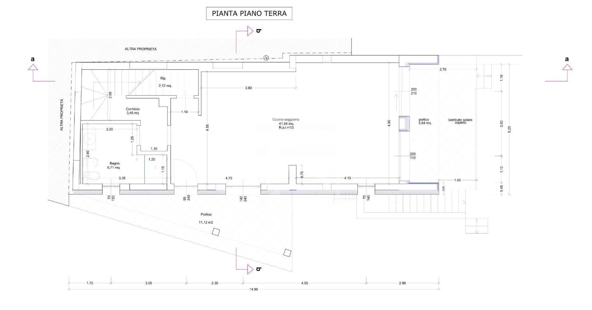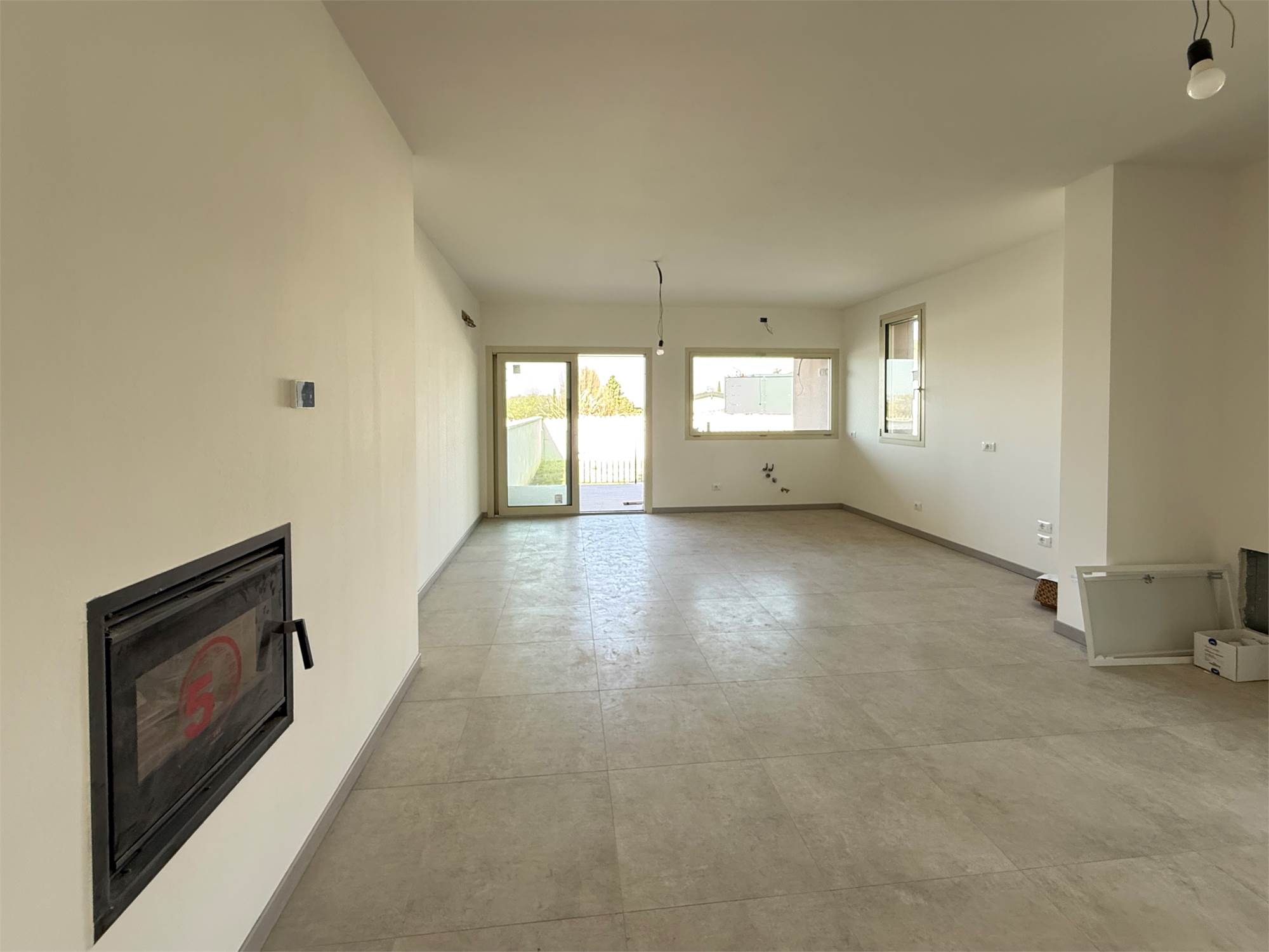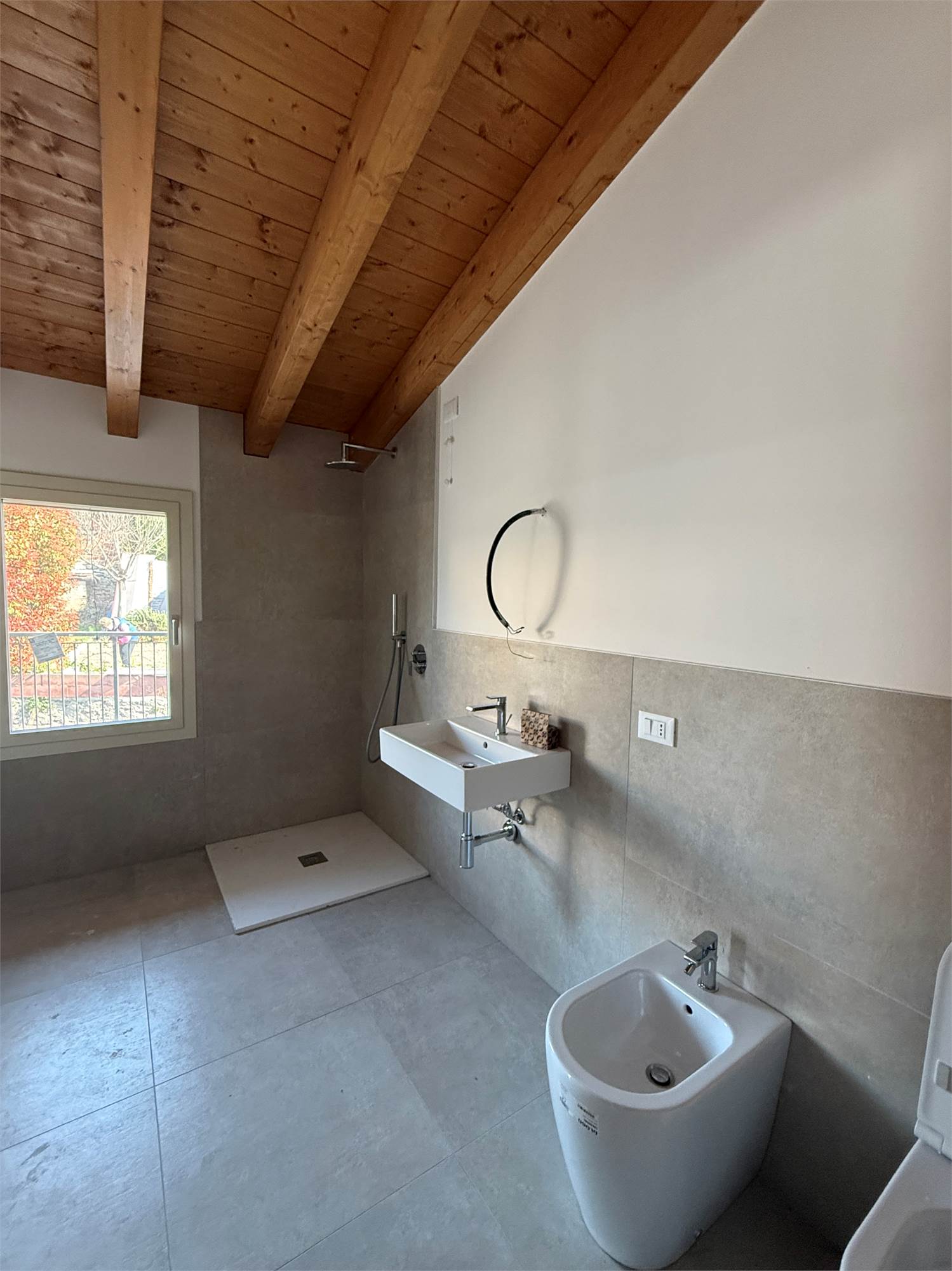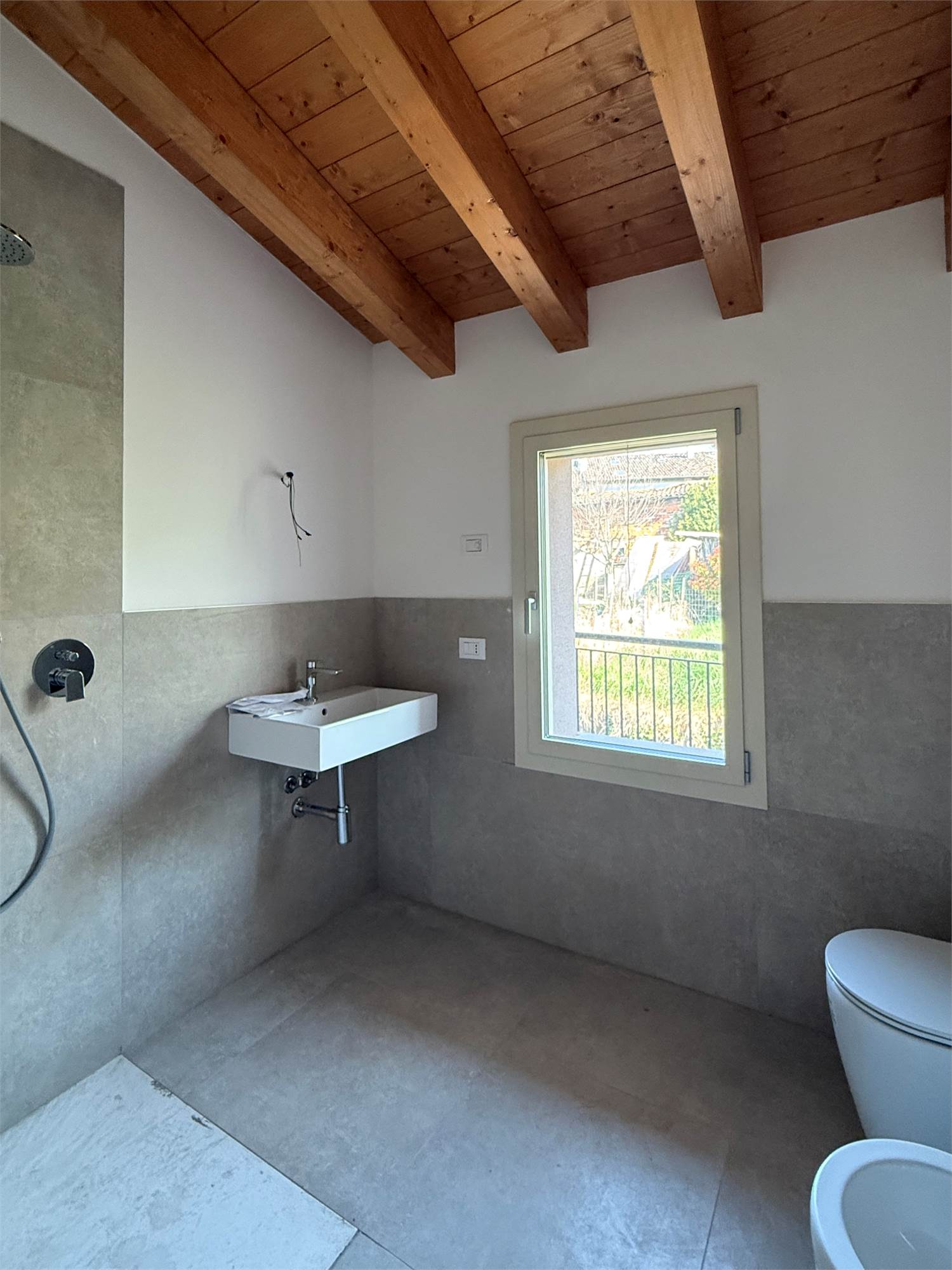 Al piano terra un accogliente portico introduce all’abitazione, dove si apre una luminosa zona giorno con soggiorno e sala da pranzo, in diretto collegamento con il giardino privato. La cucina a vista, pratica e conviviale, completa l’ambiente insieme a un comodo bagno di servizio.