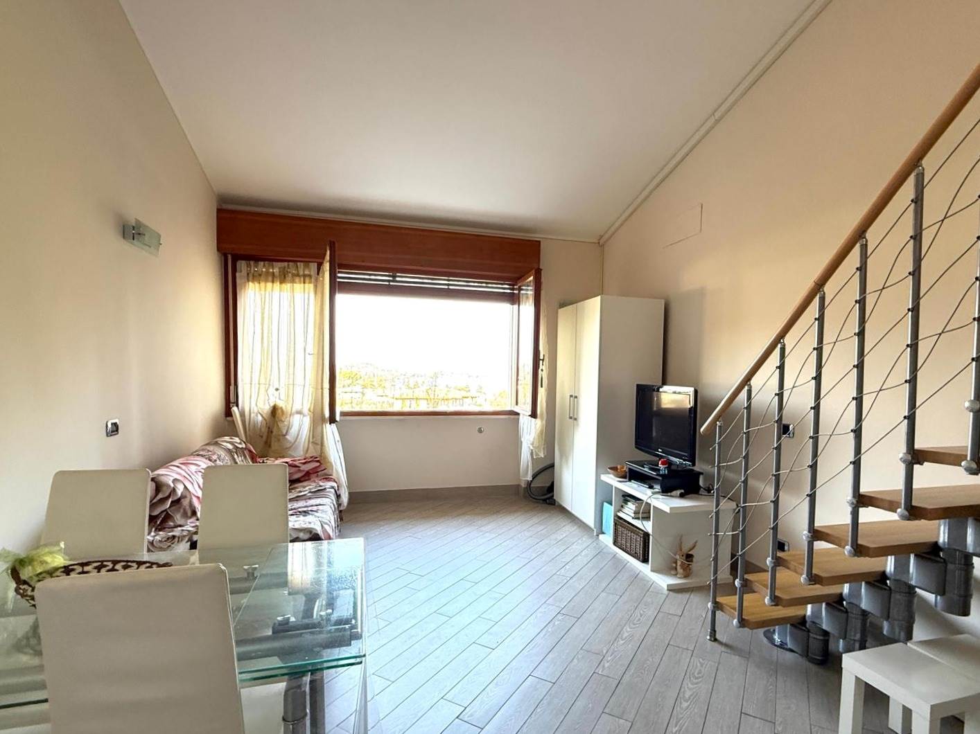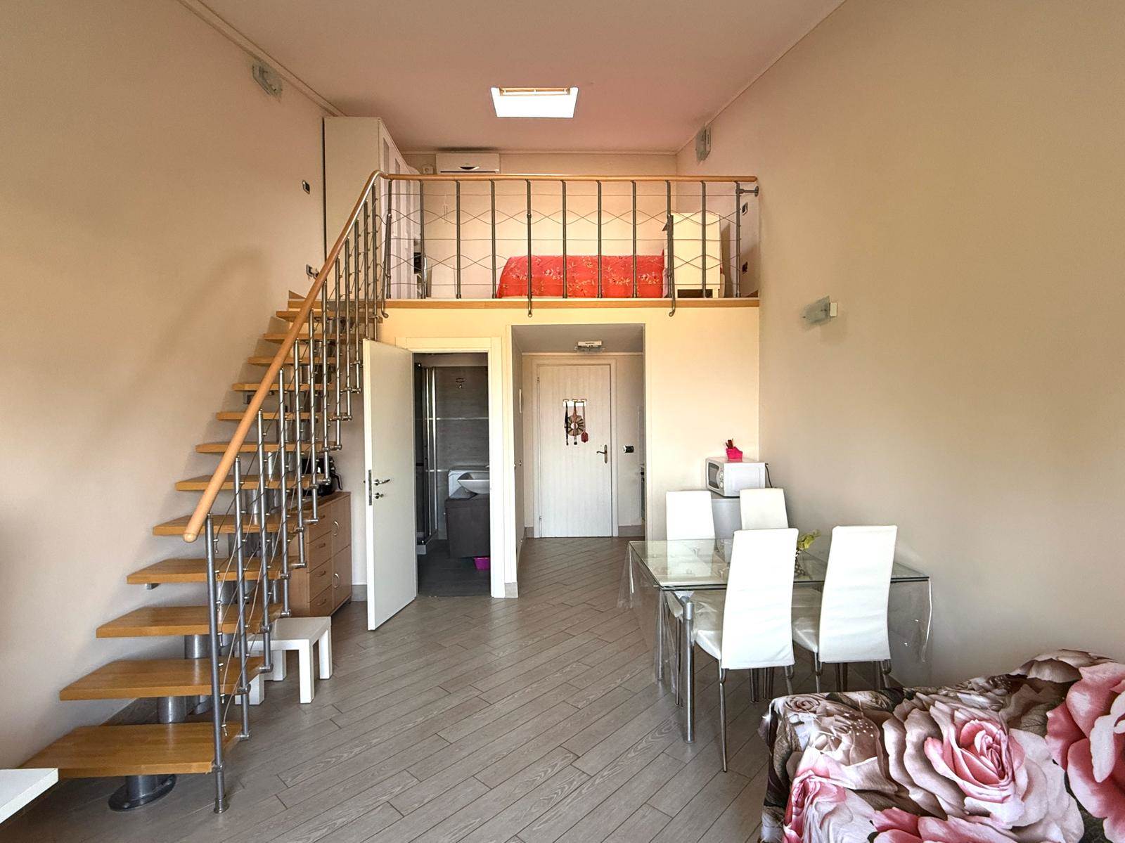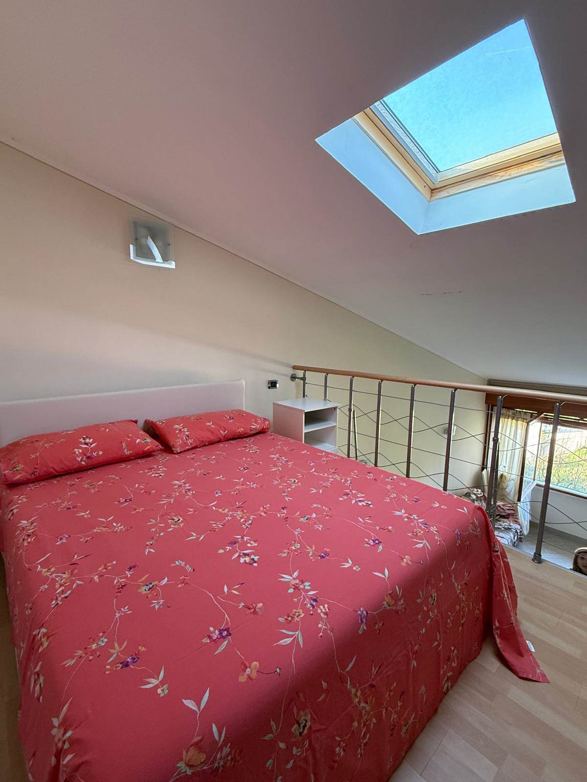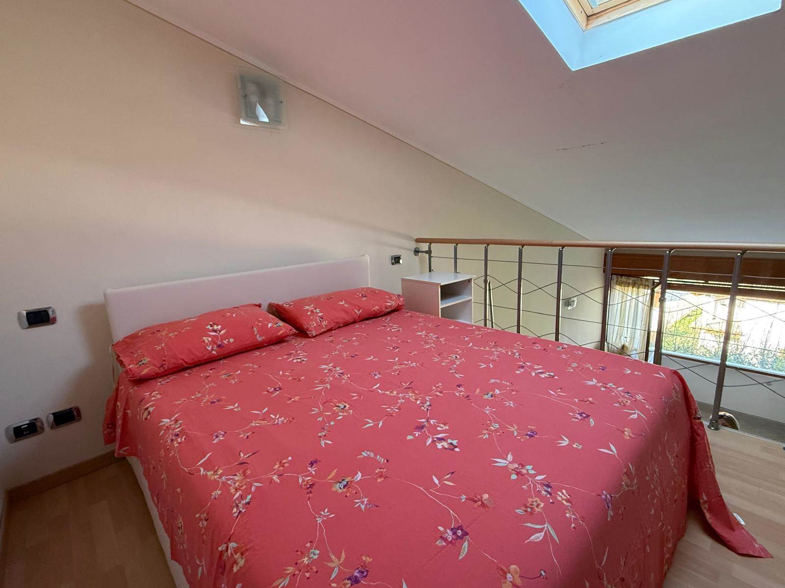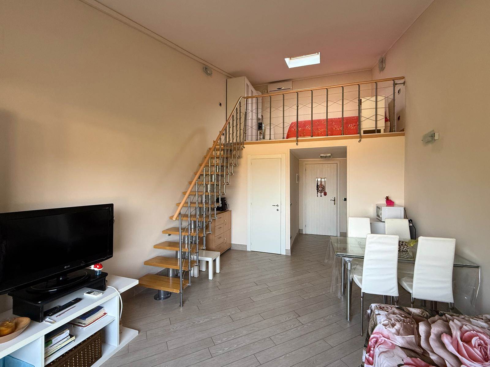 L'appartamento proposto è un monolocale con soppalco, situato al primo e ultimo piano in palazzina panoramica, vista lago, ingresso su soggiorno/cucina, bagno moderno e soppalco adibito a camera matrimoniale, dalla grande finestra del soggiorno si può godere della vista lago, l'immobile è dotato di arredo, di split per l'aria condizionata e posto auto scoperto.