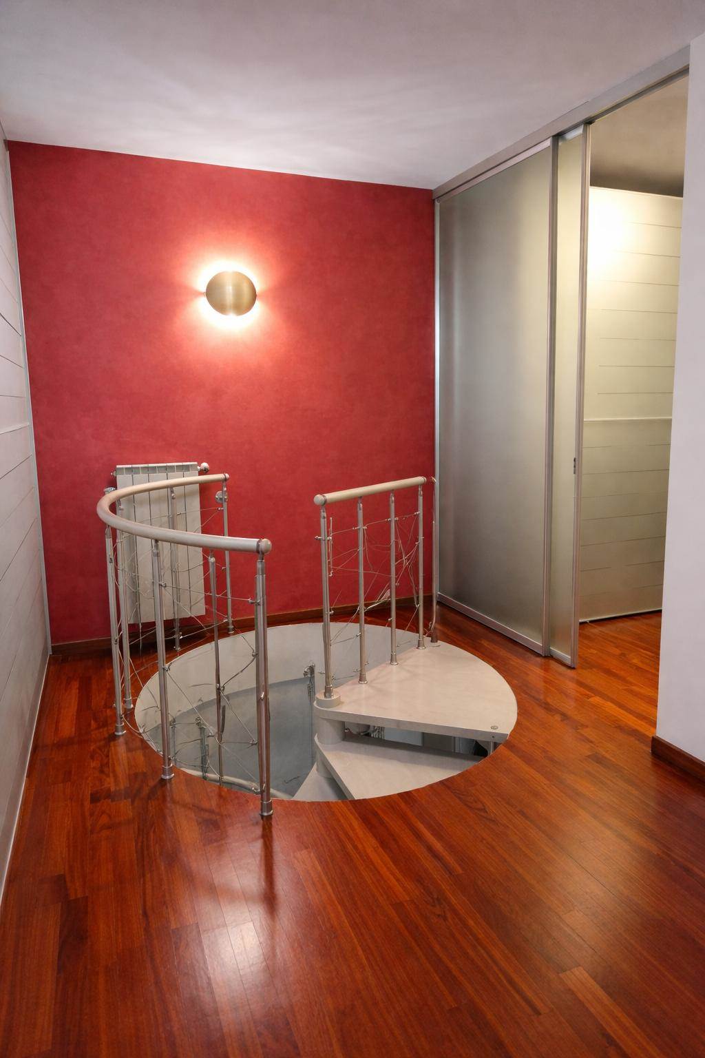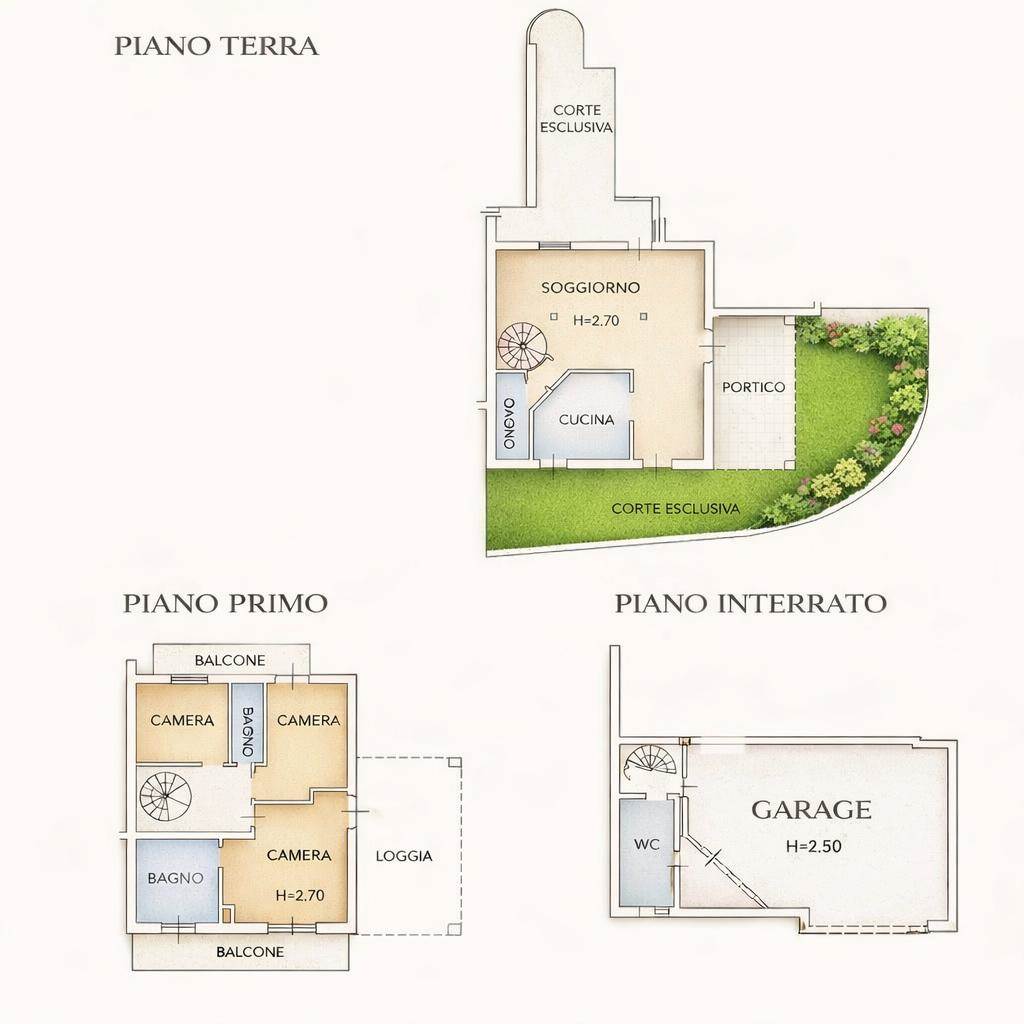 Una scala a chiocciola interna conduce direttamente al piano interrato dove si trovano un ripostiglio, la lavanderia principale con doccia ed un garage per tre autovetture con basculante.